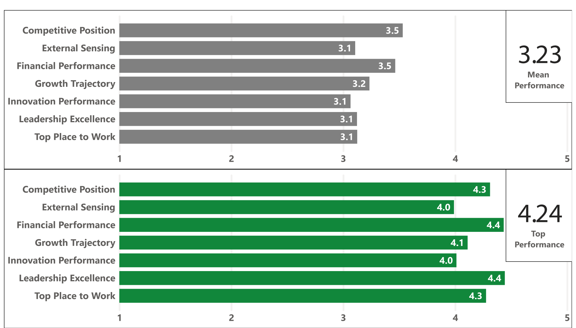 Top Performing companies outcompete in every area relative to those at the Mean or below.